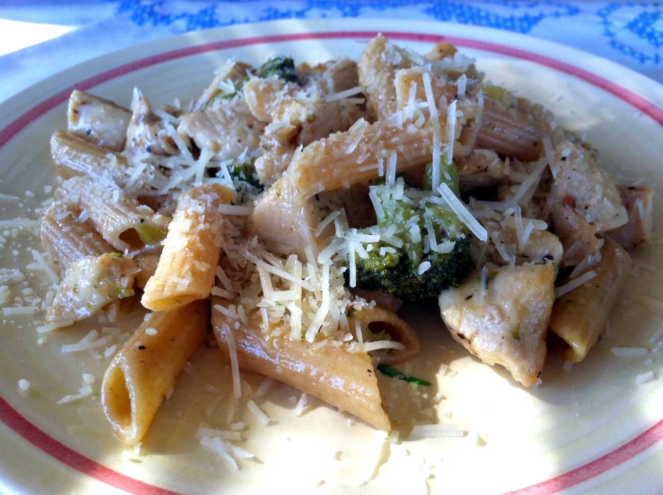 the secret ingredient in this dish is newmans own lite caesar dressing. she sauteed some diced chicken breasts in a little garlic and olive oil, added in some broccoli florets and whole wheat pene which made the dish extra hearty and filling. a salty sprinkling of parmesan cheese at the end really made this dish. i gobbled up every bite.